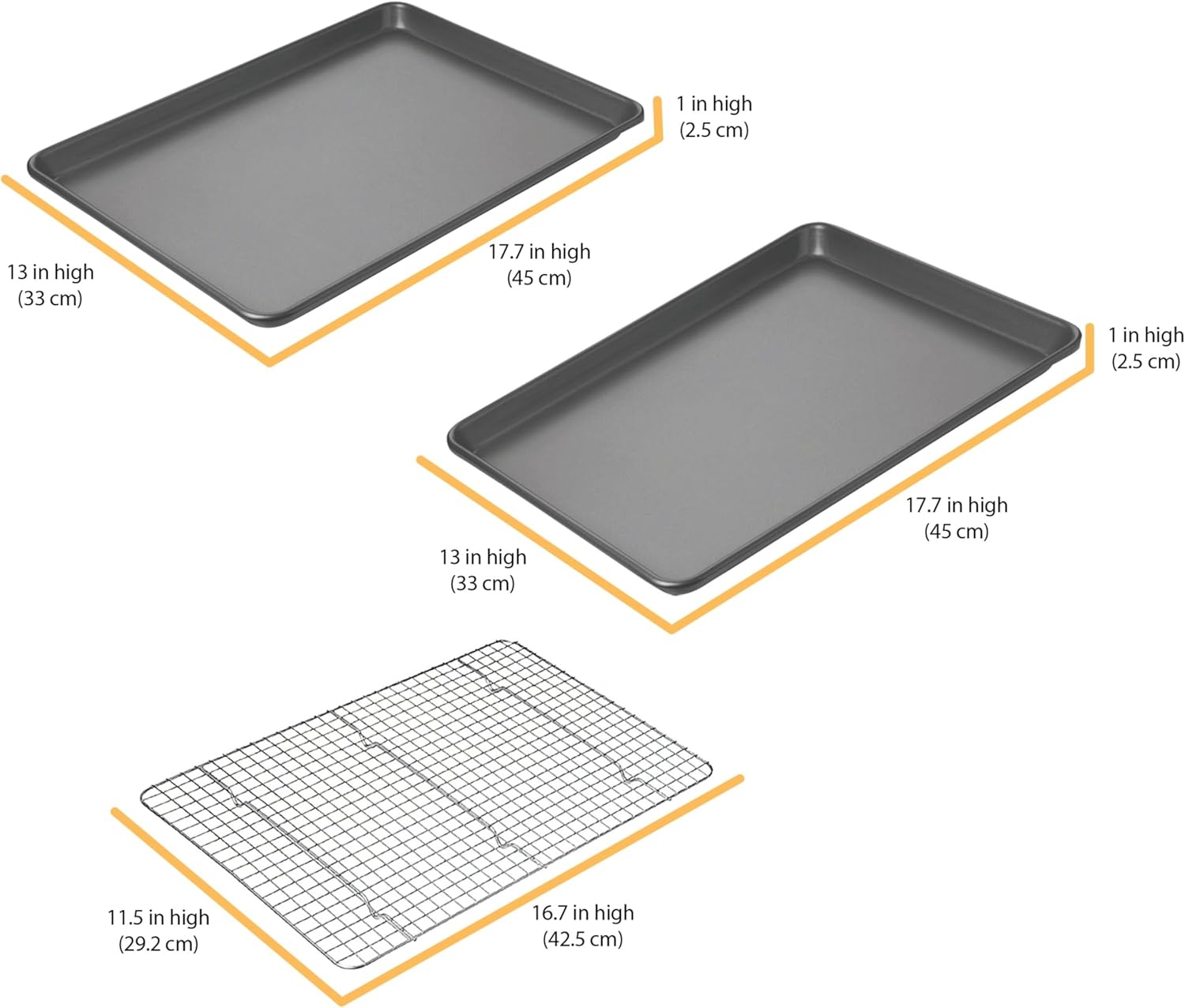 - THE PERFECT SIZED BAKING SHEET SET: The sheets feature a wire rod reinforced rim to prevent any warping. The 2 baking sheet pans measure 17.75" x 13" x 1"; inner dimensions are 17" x 12.25"x 1". The cooling rack measures 16.75" x 11.5"