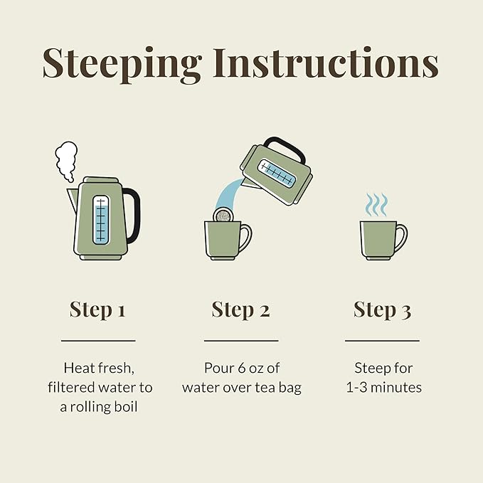 - STEEPING INSTRUCTIONS: Simply heat fresh, filtered water to just short of boiling. Then pour 6 oz water over tea and steep for 1-3 minutes.