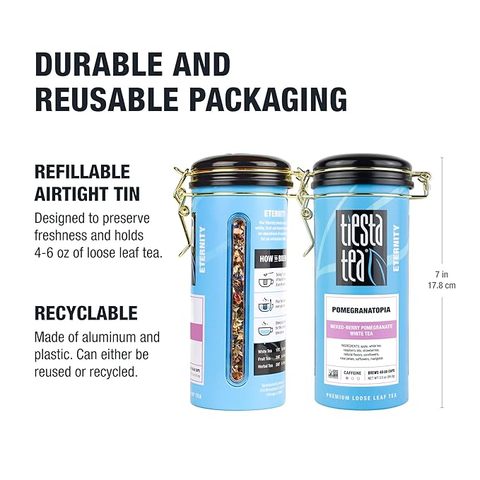 - FRESHNESS-LOCKING, REUSABLE TEA TIN: Perfect for tea enthusiasts, our refillable tin ensures your loose leaf tea stays fresh for up to 50 cups. The airtight packaging not only preserves the flavors but also doubles as a functional and elegant addition to your countertop. A thoughtful gift or a personal indulgence for tea lovers.
