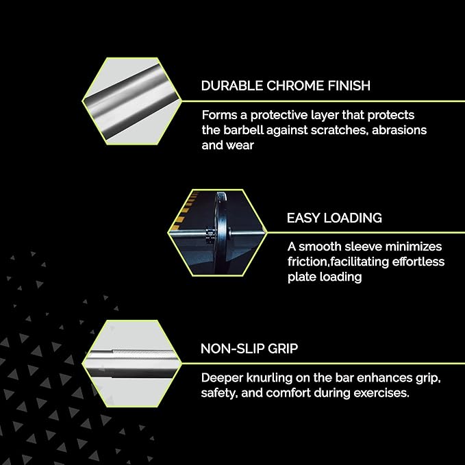 - 【 ERGONOMIC DESIGN 】: Our weight-lifting olympic barbell features a comfortable grip area of 49 inches with 1.5mm deep diamond-knurled handles that provide a secure and non-slip grip during intense training sessions. The shaft and sleeves have a durable chrome finish that provides protection against corrosion and oxidation over time, as well as a stylish look in your professional gym or home gym.