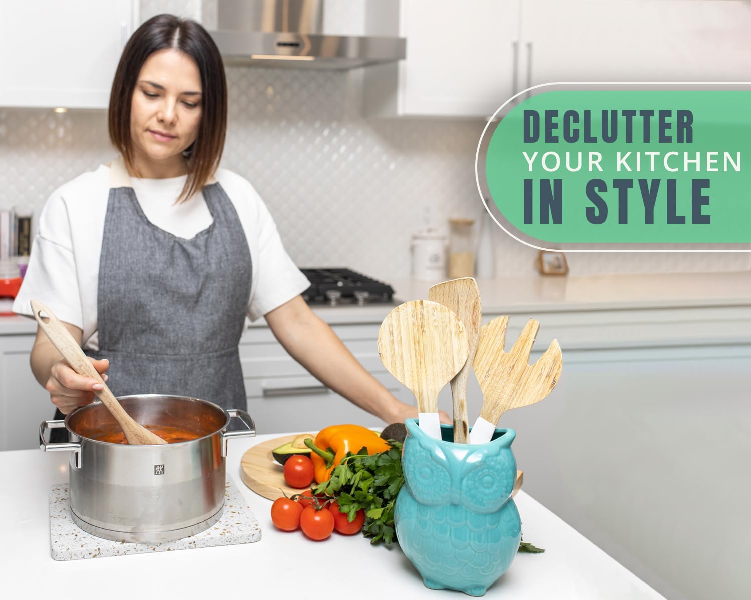 Comfify Owl Utensil Holder Decorative Ceramic Cookware Crock & Organizer, in Lovely Aqua Blue Color - Utensil Shaped Caddy and Perfect Kitchen Ceramic Decor Gift for Countertop - 5” x 7” x 4” Size