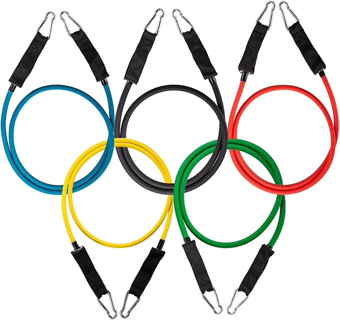 - Premium Resistance Tube Band Set: Perfect for setting up a home gym, this kit has everything you need for a full body resistance work out, Includes 5 tube bands, 2 handles, 2 ankle straps, and 1 door anchor