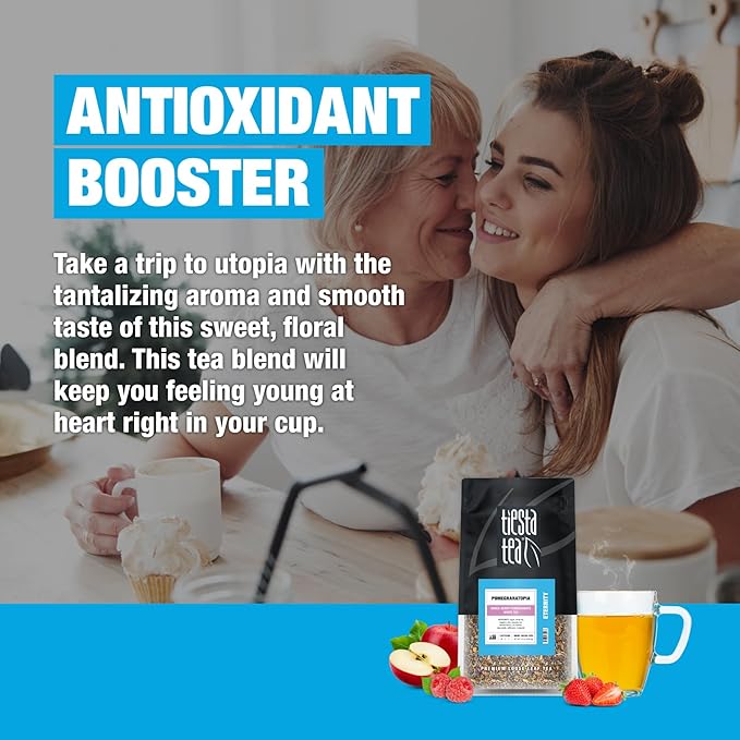 - POMEGRANATE MIXED BERRY-INFUSED WHITE TEA: Experience the vibrant flavors of Pomegranatopia with our Mixed-Berry Pomegranate White Tea. This organic loose leaf blend combines the tart sweetness of pomegranate with a delightful mix of fruit flavored tea. Whether you enjoy it hot for a cozy moment or iced for a refreshing treat, each sip captures the essence of summer.