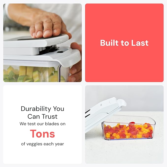 - 5-Star Design – The soft-grip TPU handle ensures controlled chopping, while the non-skid rubber base keeps the BPA-free veggie chopper steady on any surface, wet or dry. The built-in catch tray keeps counters clean and mess-free.
