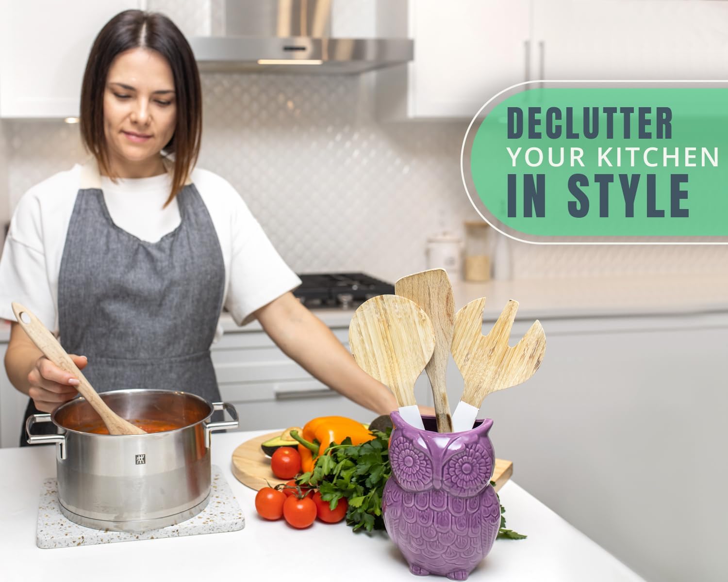 Comfify Owl Utensil Holder Decorative Ceramic Cookware Crock & Organizer, in Lovely Purple Color - Utensil Caddy and Perfect Kitchen Ceramic Decor Gift - 5” x 7” x 4” Compact & Cute