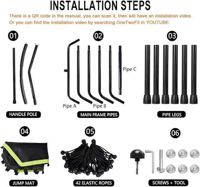 - ☻NOTE☻---Trampoline equipment setup requires some physical labor-please read user manual or find the installation video by searching OneTwoFit in YOUTUBE for set-up and it is best having two people available set-up.