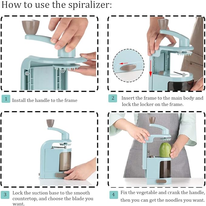 - Easy to Operation and Clean: The big suction cup makes the spiral zucchini cutter steady when operation, it will save much labor. The spiralizer hard vegetable slicer is hand wash easily with the cleaning brush (included).