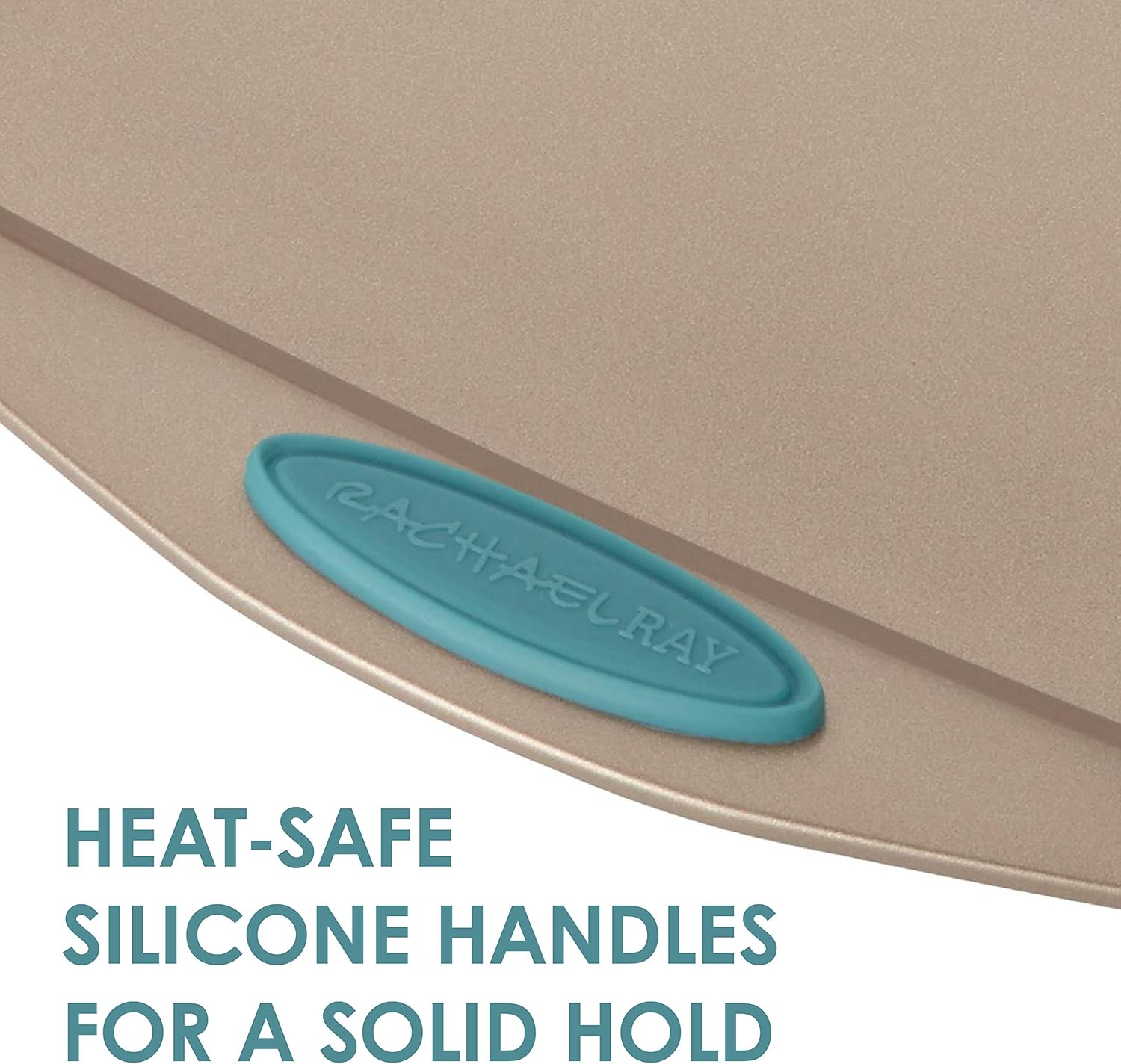 - EASY HANDLING NONSTICK BAKEWARE: Oven safe to 450 degrees F (lid excepted), wide pan handles with colorful heat-safe silicone grips offer comfortable grasp even with potholders