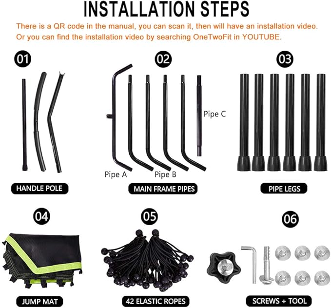 - ☻NOTE☻---Trampoline equipment setup requires some physical labor-please read user manual or find the installation video by searching OneTwoFit in YOUTUBE for set-up and it is best having two people available set-up.
