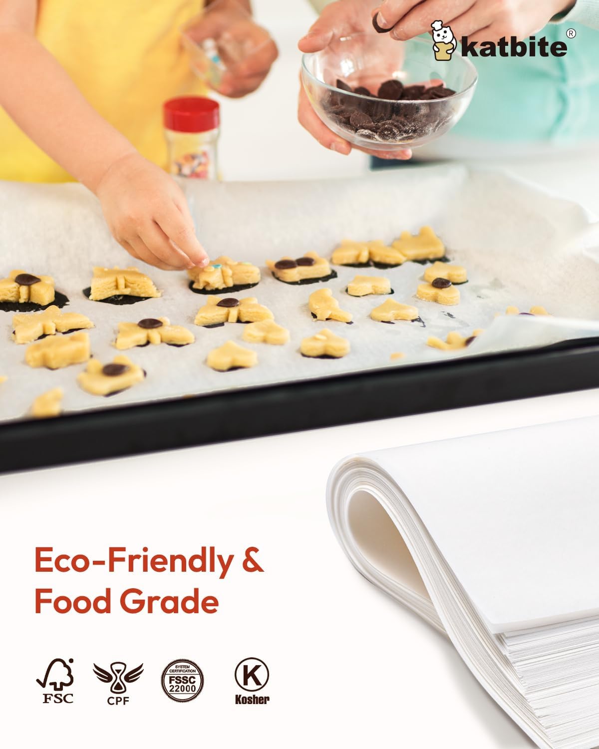 - HEALTHY & NON-TOXIC - Safety certificate approved. Katbite full sheet pan paper liners, made from natural 100% wood pulp and totally fluorescent free. Food grade silicone coating makes your baking safe and non-toxic.