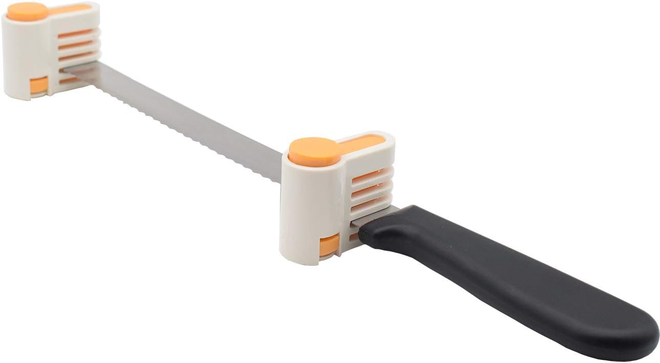 - Operation is very simple. press two button of slicer to clamp knife blade at same layer. Move the blade horizontally at flat surface. You can get perfect uniform cake or toast slice at anywhere.