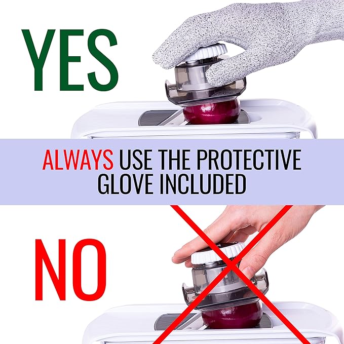 - Keeping You And Your Family Safe - We know our julienne slicer and mandoline slicer stainless steel blades are high quality and razor sharp. It comes with a fingerguard and protective glove to keep you safe whilst you are using the vegetable mandoline slicer. The ABS plastic is nontoxic and BPA free!