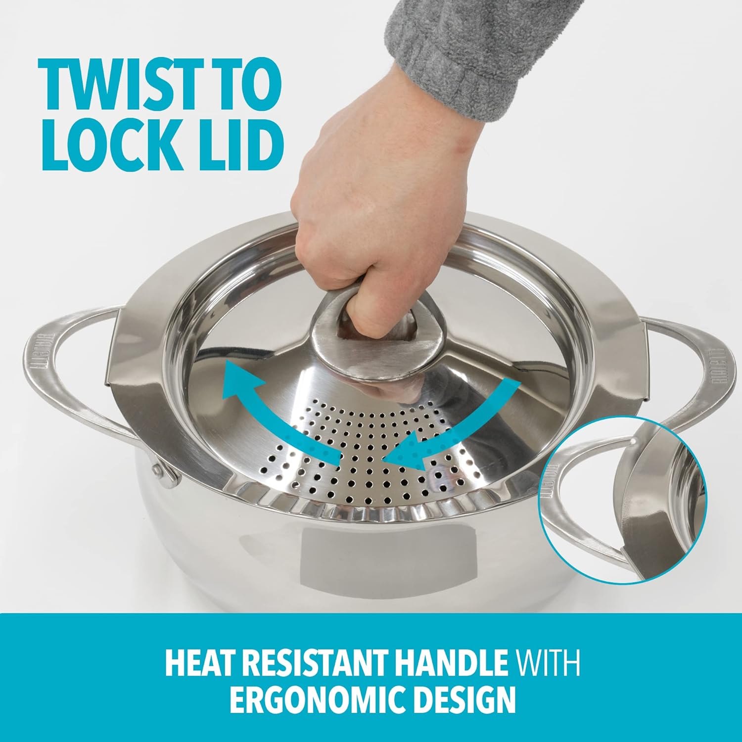 - STRAINER LID: Pot's lid twists and locks into place securely and features integrated straining holes for additional safety and convenience when draining excess water out of the pot