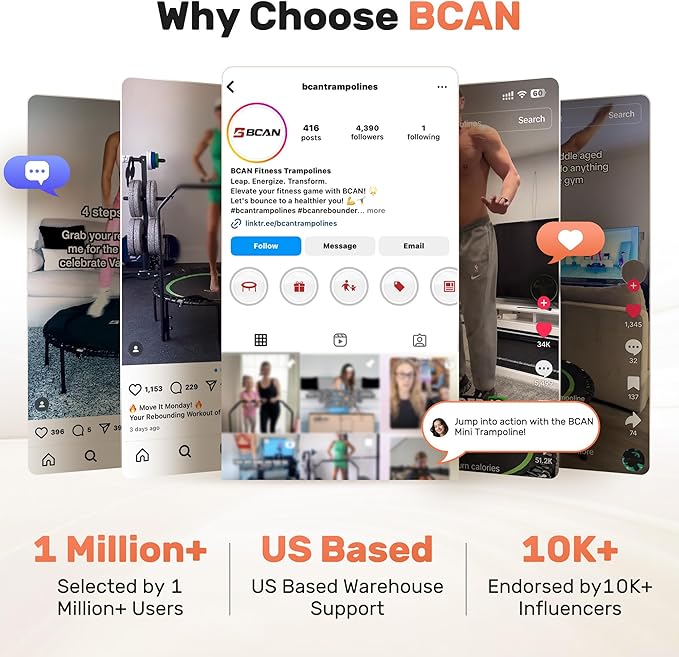 - Foldable Frame Base: With unique foldable design, BCAN rebounder trampoline can be folded size less to 1/4 after removing handle and legs. Easy to storage your mini trampoline anywhere, bed, sofa, car trunk, closet, etc