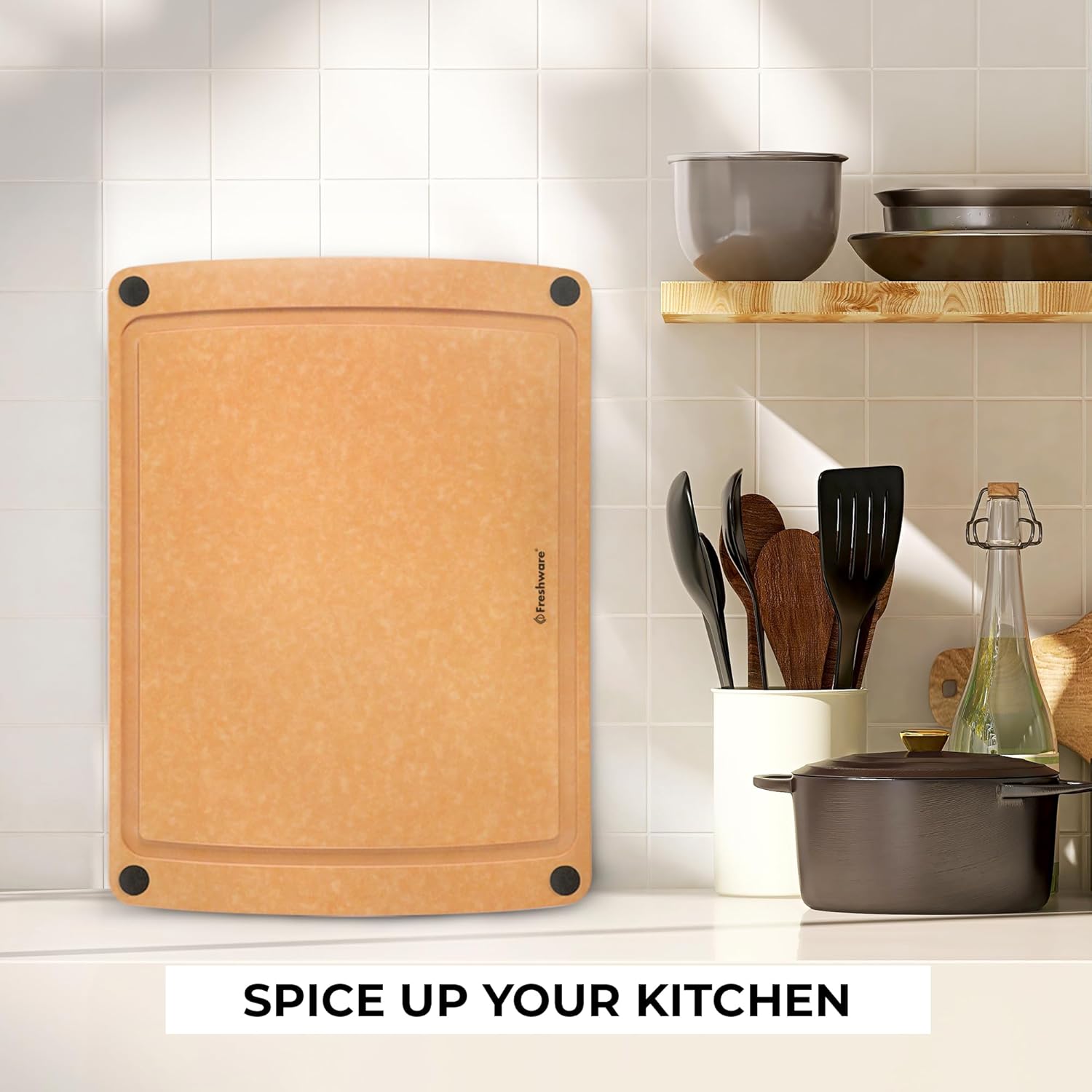- β EASY TO CLEAN & DISHWASHER SAFE - X Large 18" x 13" wood fiber cutting board, wooden natural color, juice groove, non-slip silicone feet, dual-sided cutting surface. If you are looking for a crafted wood cutting board that is extremely safe to use, then we got you covered. BPA-free, dishwasher safe, Freshware wood cutting boards provide a clean food prep surface for every meal.