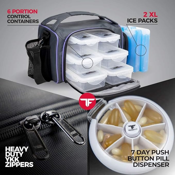 ThinkFit Insulated Meal Prep Lunch Box with 6 Food Portion Control Containers - BPA-Free, Reusable, Microwavable, Freezer Safe - With Shaker Cup, Pill Organizer, Shoulder Strap & Side Pocket (Purple)