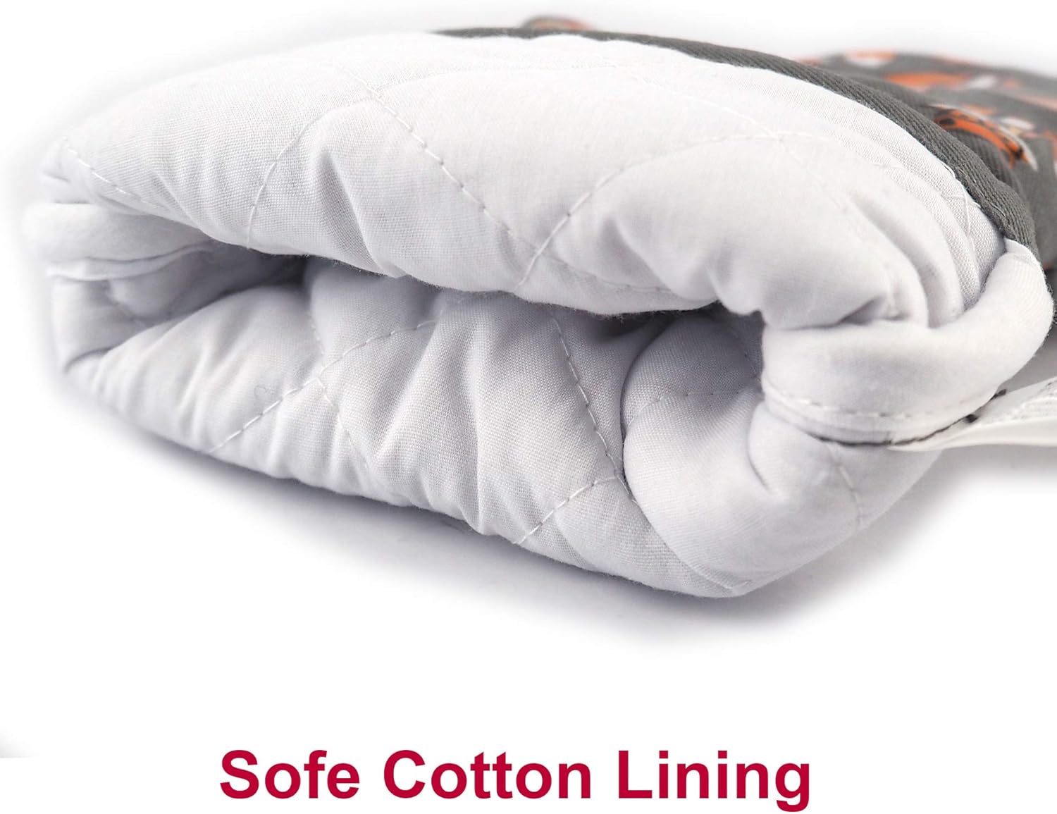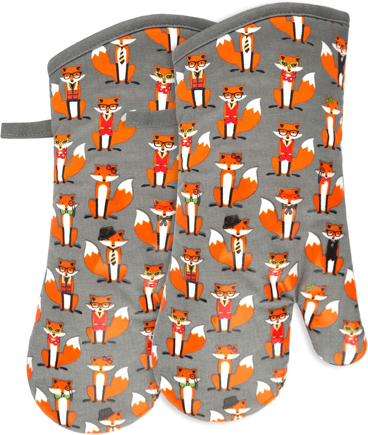Oven Mitts Gloves 1 Pair Heat Resistant 480 ℉ Non Slip Clear Silicone Printed Fox Comfortable Cotton Lining Kitchen Women Men Cooking Baking Barbecue Machine Washable (Fox, Gray Mittens)