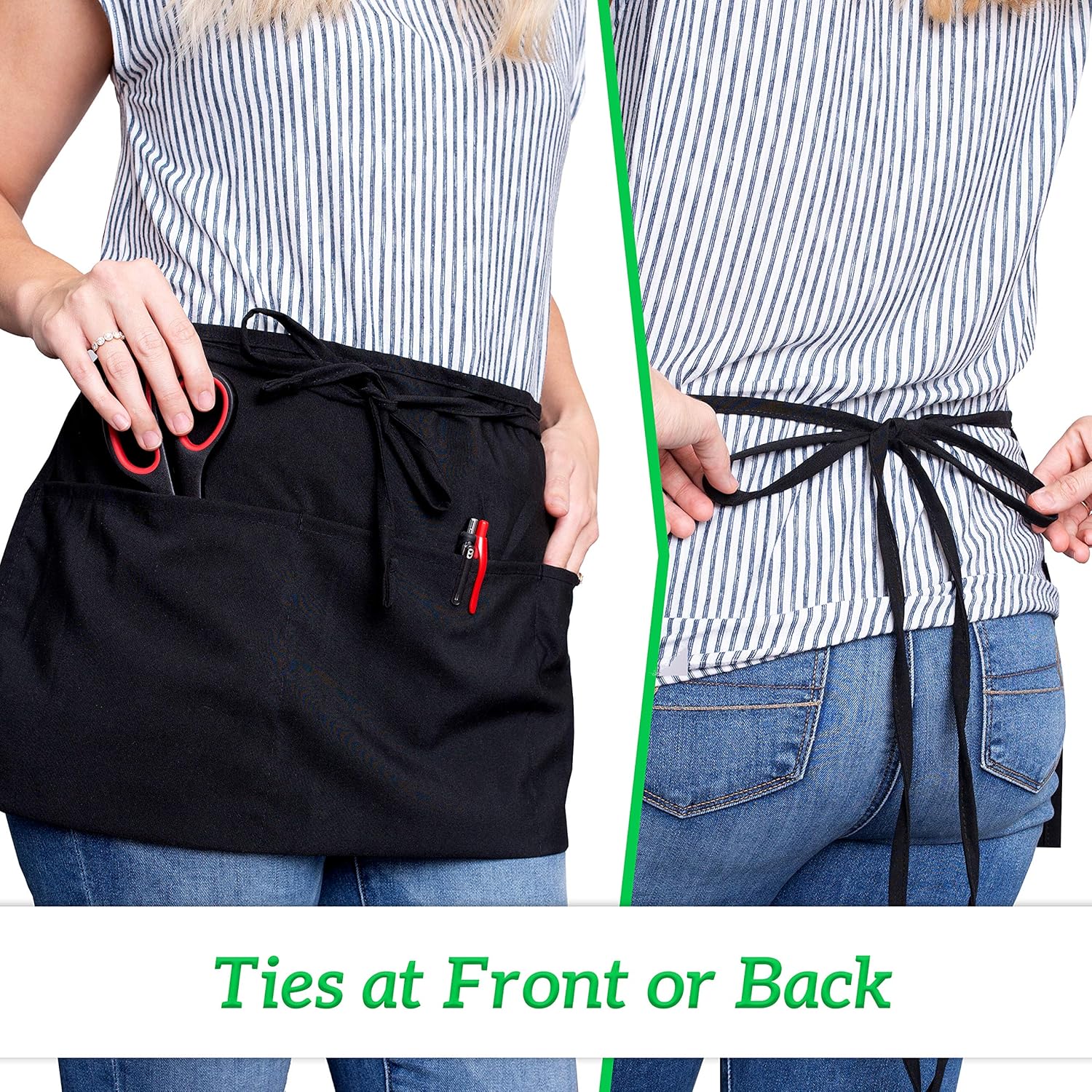 GREEN LIFESTYLE Server Aprons with 3 Pockets - Waist Apron, Waitress Apron for Women and Man, Water Resistant with Long Waist Strap Reinforced Seams, Half Apron (12 Pack - Black)