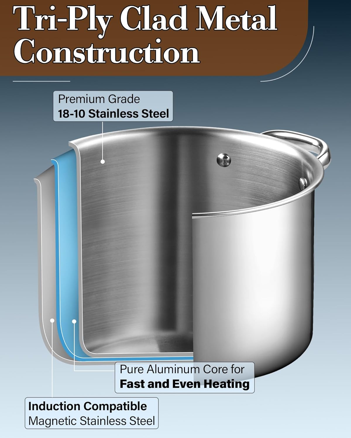 - Tri Ply Clad: 8 Quart stockpot is made of 18/10 stainless steel, aluminum and a metal outer layer, which ensures good thermal conductivity and even heat distribution, helping food heat up quickly and evenly