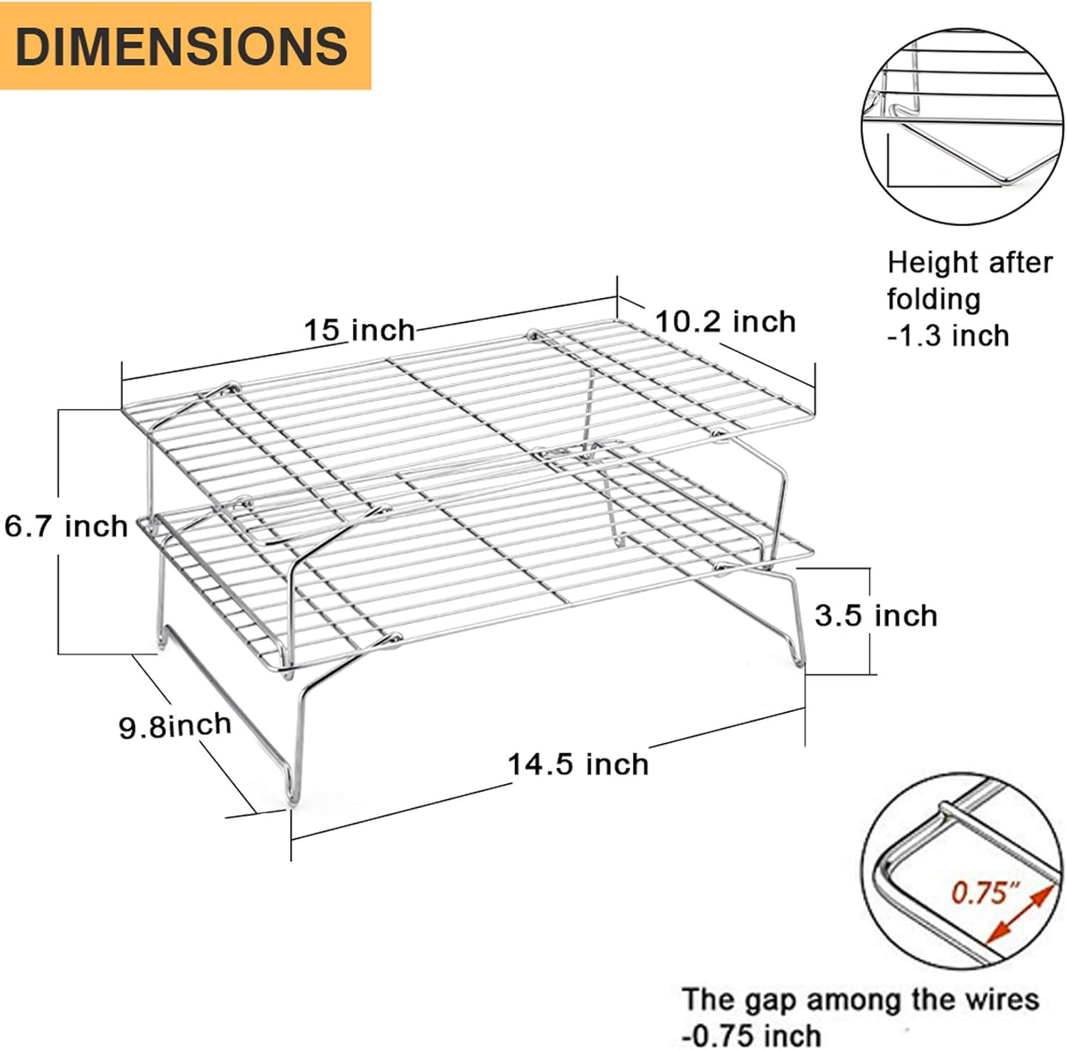 - ▶FLEXIBLE FEET◀ The flexible feet can be swung over 90°, Come with 3.5-inch height when it opened fully, Make the rack stack stably on another rack, Provide higher and larger space to cool and bake more food at once, Collapsible feet for easily folding to 1.3-inch height, Easy storage in your cabinet or drawer