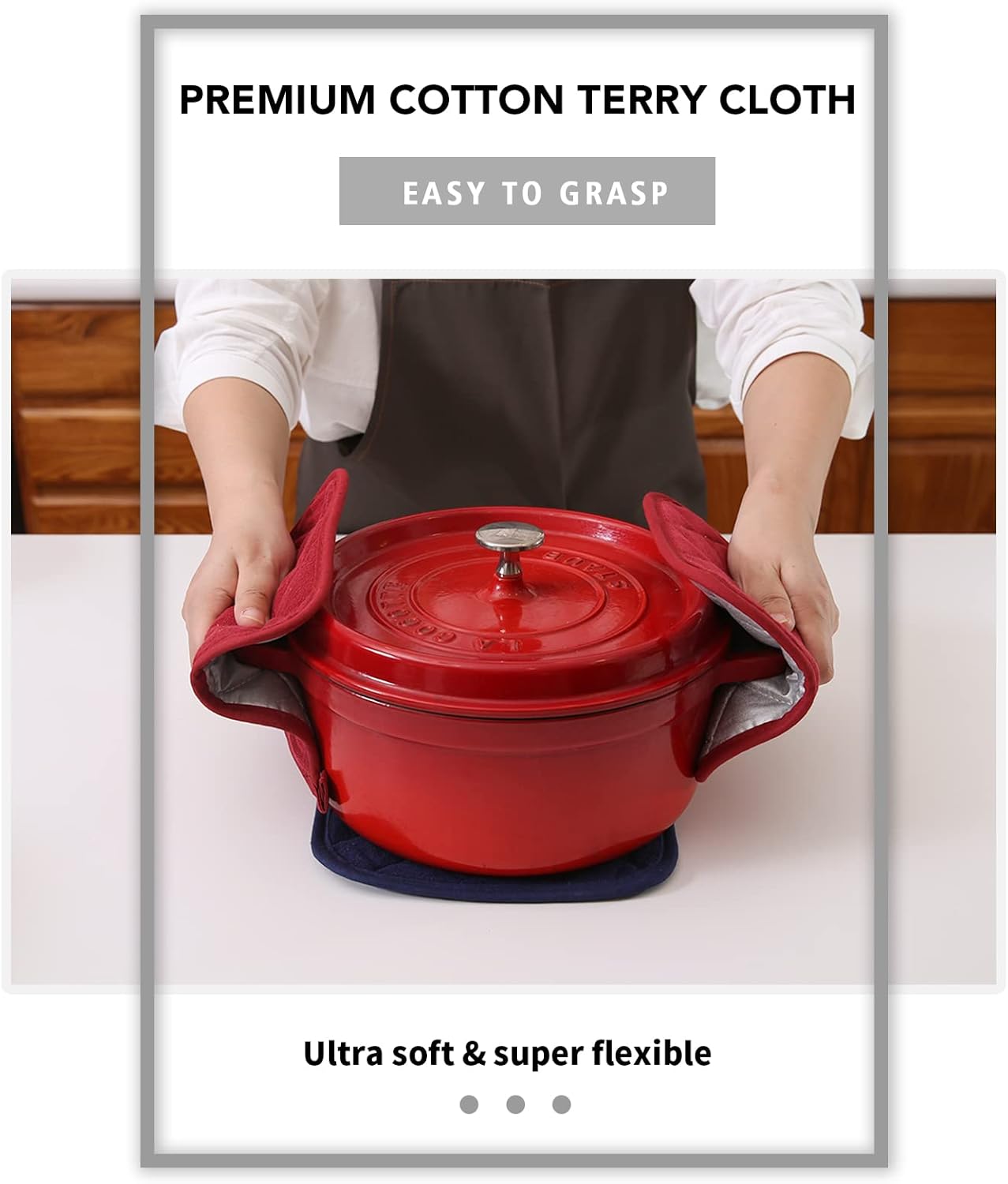 - QUILTED AND PADDED - Heat resistant up to 400 degrees allowing safe removal of baking dishes and cast iron from the oven and hot pots from the stove.