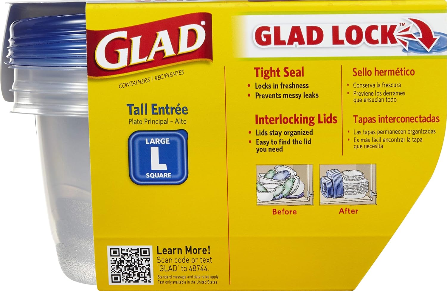 Glad GladWare Tall Entree Food Storage Containers - Large Square - Meal Container Holds up to 42 Ounces of Food - Lock Tight Seal, 3 Count - 6 Pack