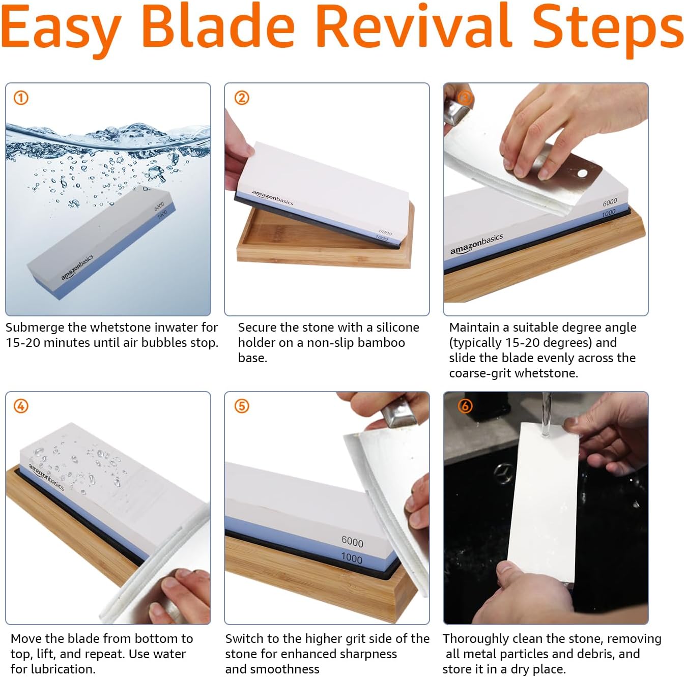 - Dual-sided whetstone: 1000 grit on one side and 6000 grit on the reverse; stone uses water (vs. oil) for sharpening; cleans easily with water