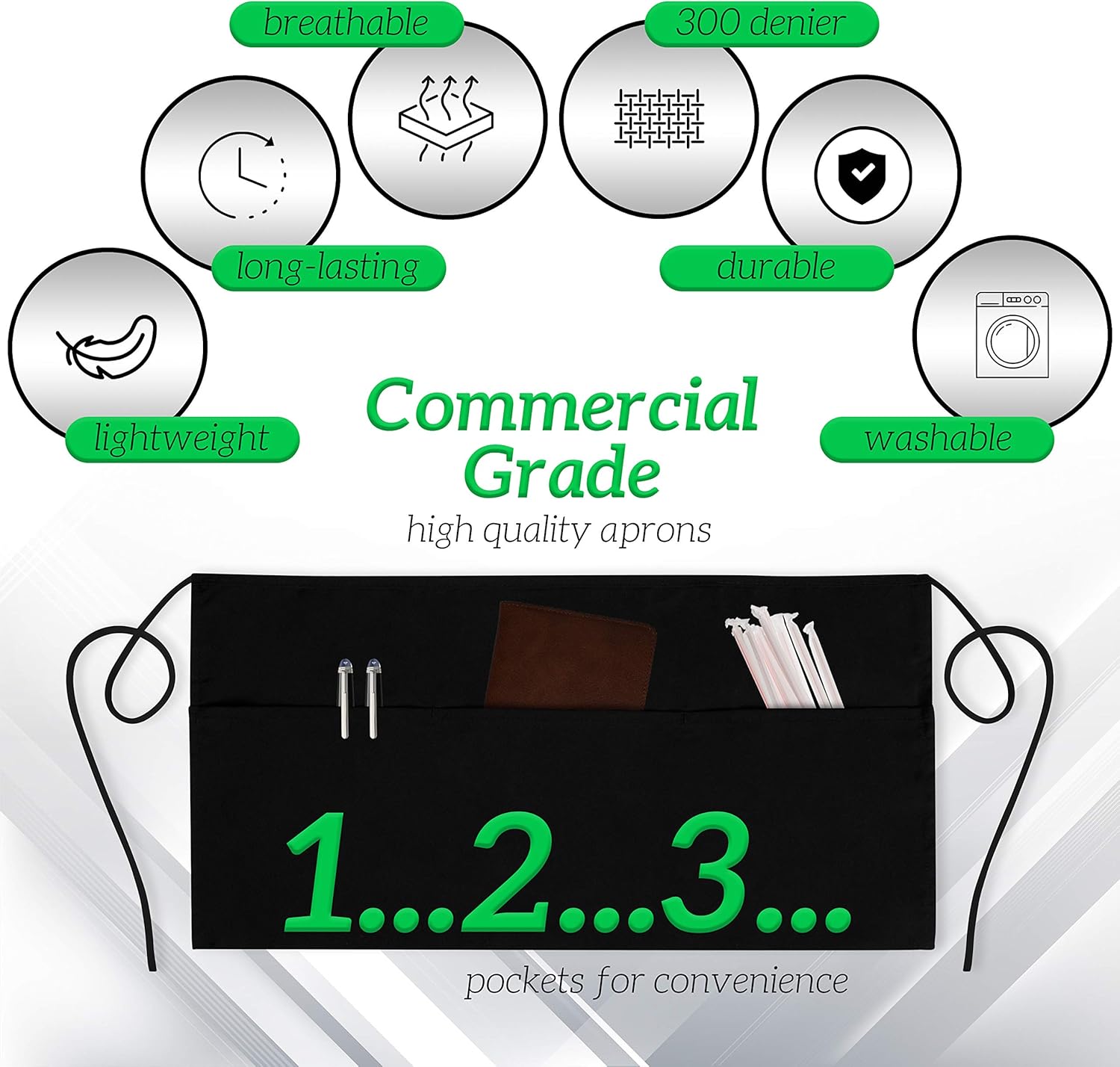 - Commercial Grade: black aprons for servers are perfect for servers in Restaurants , Bars, Cafés , or at Home in the Kitchen, Garden, or Craft Table. These Comfortable, Durable, Light Weight and Cotton Enriched waist aprons comes with 3 pockets and you can wear them for all your serving needs.