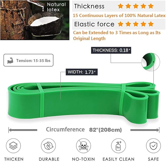 - ✅ PERFECT FOR ANY KIND OF EXERCISE These green workout bands provide resistance of 50-120lb. Our heavy-duty rubber bands have medium to heavy resistance for leg/back exercises and dynamic resistance for powerlifting. The flat pull-up resistance bands are perfect for assisting your pull-ups.