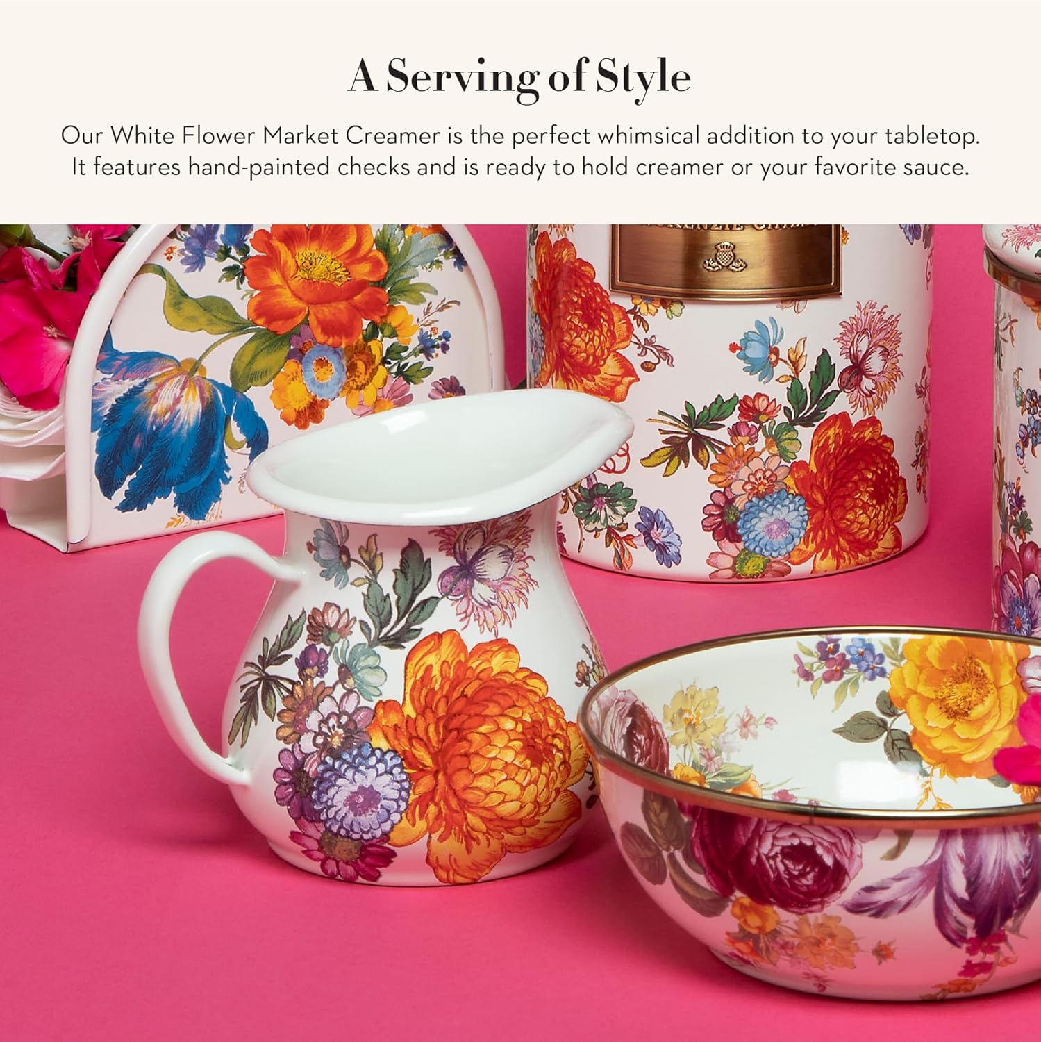- UNIQUE ENAMEL CREAMER CONTAINER: A MacKenzie-Childs Enamel Creamer is the perfect way to energize your morning cup of joe with frothed cream or steamed milk. This versatile vessel can also be used for pouring hot fudge, maple syrup, spaghetti sauce, or salad dressing.