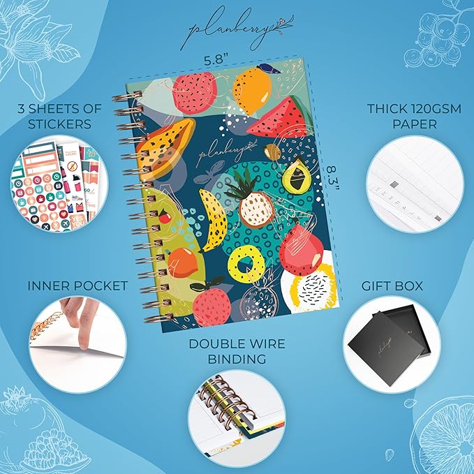 PLANBERRY Food Journal Premium – Nutrition Planner – Diet & Calorie Tracker – Meal & Exercise Diary – Weight Loss Journal (Fresh Multifruit)