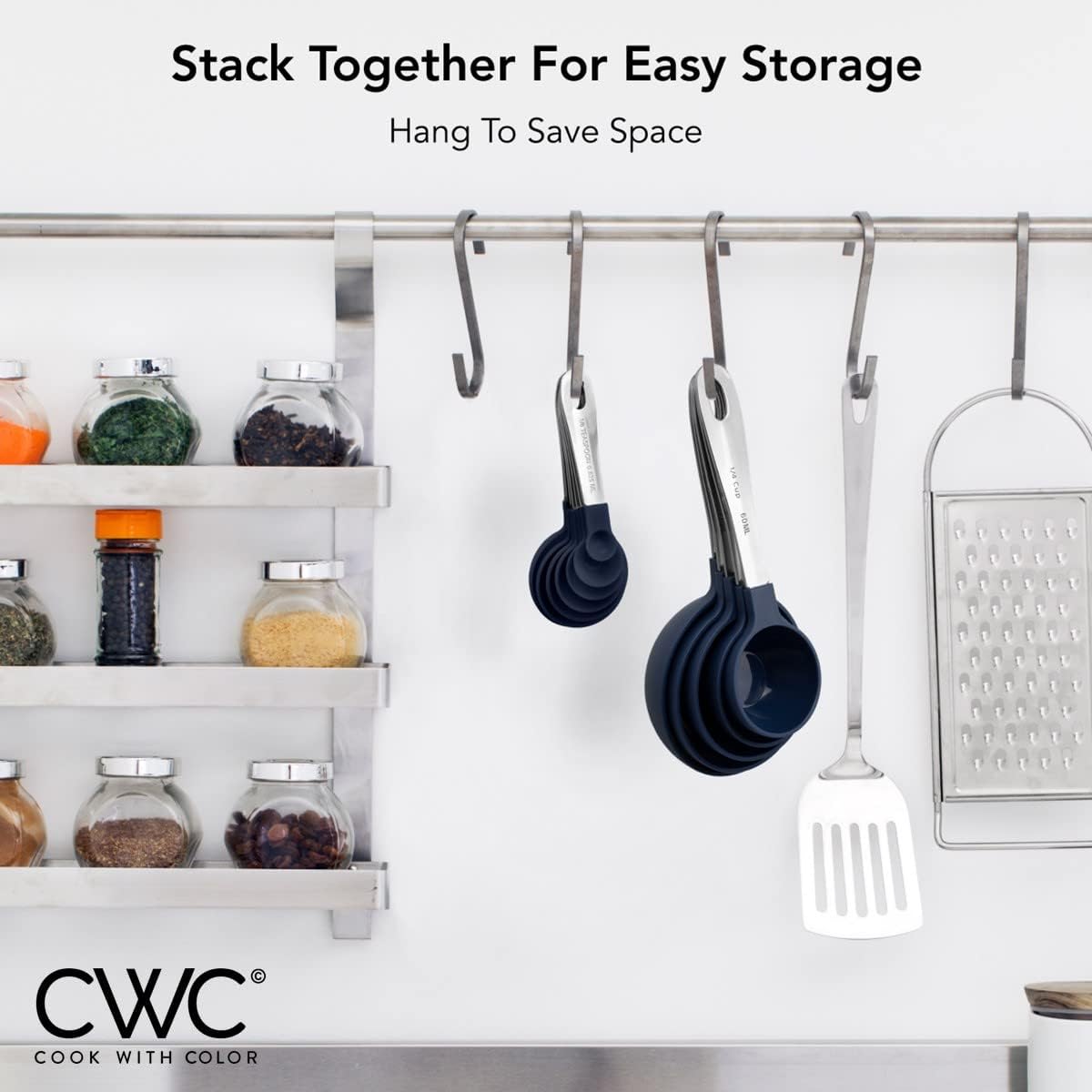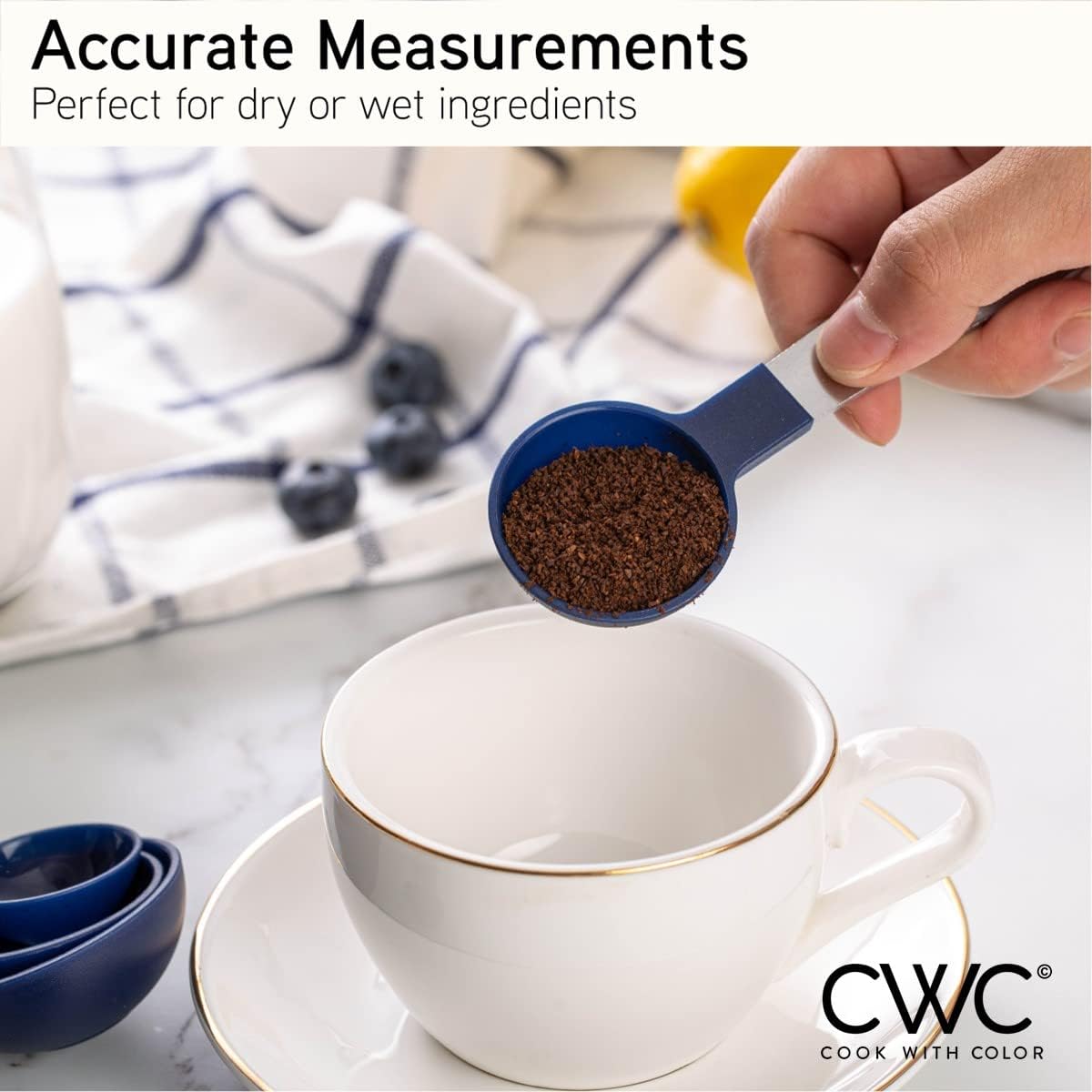- Cook with Color's set of measuring cups and spoons will bring a pop of color to your recipe prep with an easy to use measure set with all the basics still intact.|Round plastic smooth edged cups and spoons with copper coated stainless steel handles – sizes engraved in handles in US and metric measurements that will not rub out or fade.|Measuring cups: 1 cup 3/4 cup 1/2 cup 1/3 cup and 1/4 cup; Measuring spoons: 2 Tbsp. 1.5 Tbsp. 1 Tbsp. 2 tsp. 1 tsp 1/2 tsp. 1/8 tsp.|Set nests for compact and easy storage; hand wash with warm soapy water. Boxed and ready to be gifted. Perfect gift for family and friends.|CUSTOMER SATISFACTION GUARANTEE - At Cook with Color our #1 goal is customer satisfaction please do not hesitate to reach out to us with any issues or comments so we can ensure that your Cook with Color order experience adds just the right color and taste!