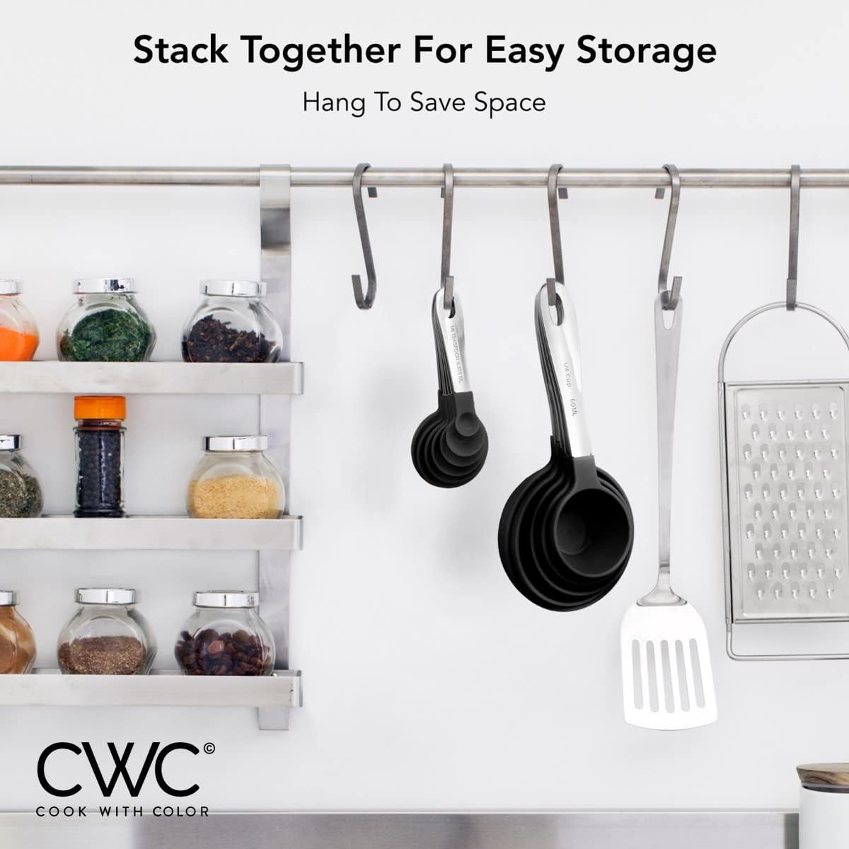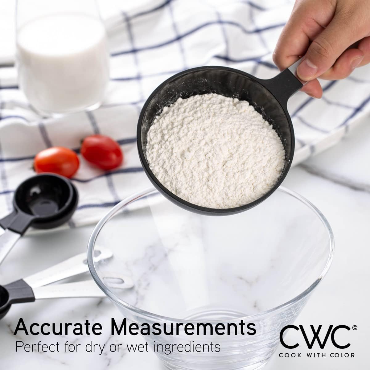 - Cook with Color's set of measuring cups and spoons will bring a pop of color to your recipe prep with an easy to use measure set with all the basics still intact.
