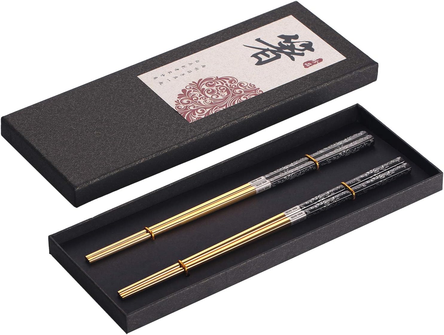 Chopsticks Reusable Titanium Plated Metal Chopsticks 304 Stainless Steel Chopstick Dishwasher safe Japanese Korean lightweight Engraved Anti-slip Chop sticks for Eating 2 Pairs Gift Set Black Gold