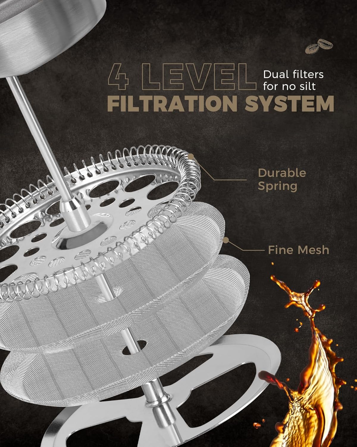 - LOOKING FOR COFFEE PRESS FOR MATCHING UP YOUR KITCHEN? We, the POLIVIAR french press coffee maker will be your smart choice. While the coffee pot is made from food grade stainless steel with stylish long-lasting coating, It is easily to match up your kitchenwares and your kitchen's theme. Also, the ergonomic handle with real wood will maximize the fantastic time of grounds you loved.