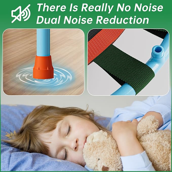 - 【SAFE AND FUN】 The padded handlebar is adjustable from 32.6” to 40.5” which fits your kid’s height perfectly. Kids can use the handlebar for easy grip to control their bounce. This springless trampoline is safer than the spring rebounders, primarily due to more soft parts. There is less of a chance of experiencing pinched fingers or toes, regardless of the safety precautions in place. Moreover, this trampoline has been added with a covering on top of the bands to provide safer jump pad surface