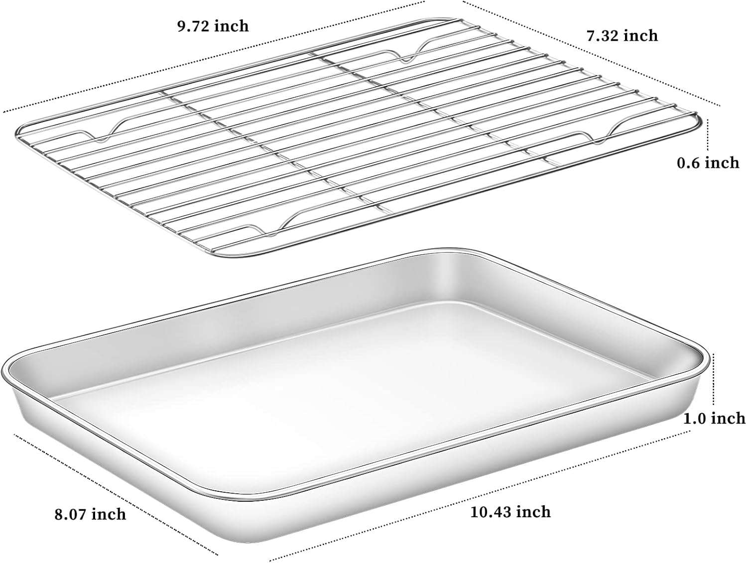 - š¬ [CLASSIC SET FOR BAKING] You will get 4 pieces, including 2 baking sheets - 10.43 x 8.07 x 1 inches and 2 cooling racks - 9.72 x 7.32 x 0.6 inches, apply to regular oven and toaster oven. Sheet pans are used for baking and cooling rack set can be used separately or together since the cooling rack fits perfectly into the half sheet pan.