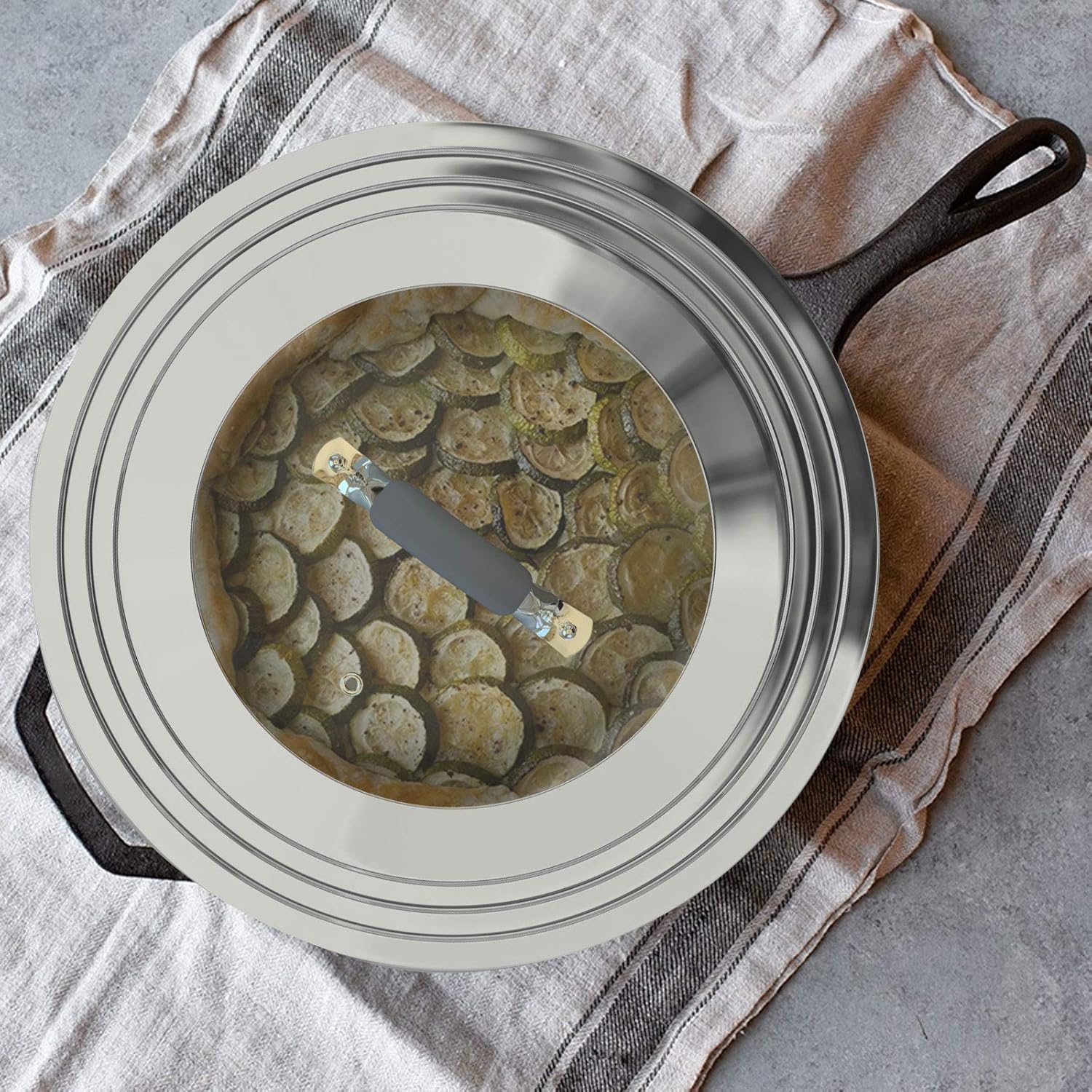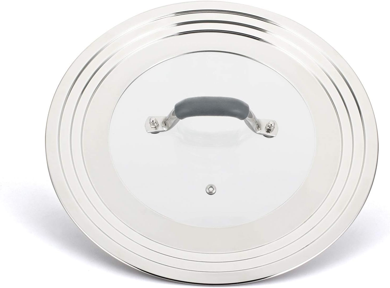 - Steam Vent: The vent hole of the universal frying pan lid exhausts steam instantly to avoid overflow, also provides a channel to insert a thermometer.