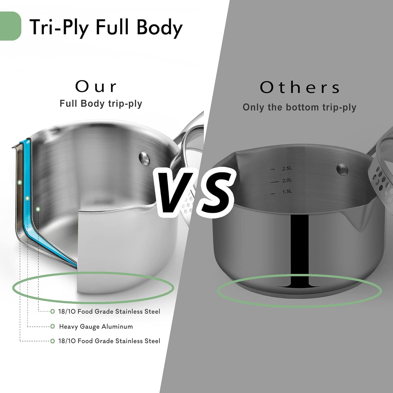 - Ideal Choice: The stainless saucepan with cover constructed Tri--ply stainless steel for whole body with multi-clad construction avoids heat spots and distributes safe heat evenly. Oven-safe to 550°F (glass lid is oven safe to 400℉). Dishwasher-safe for quick cleanup.