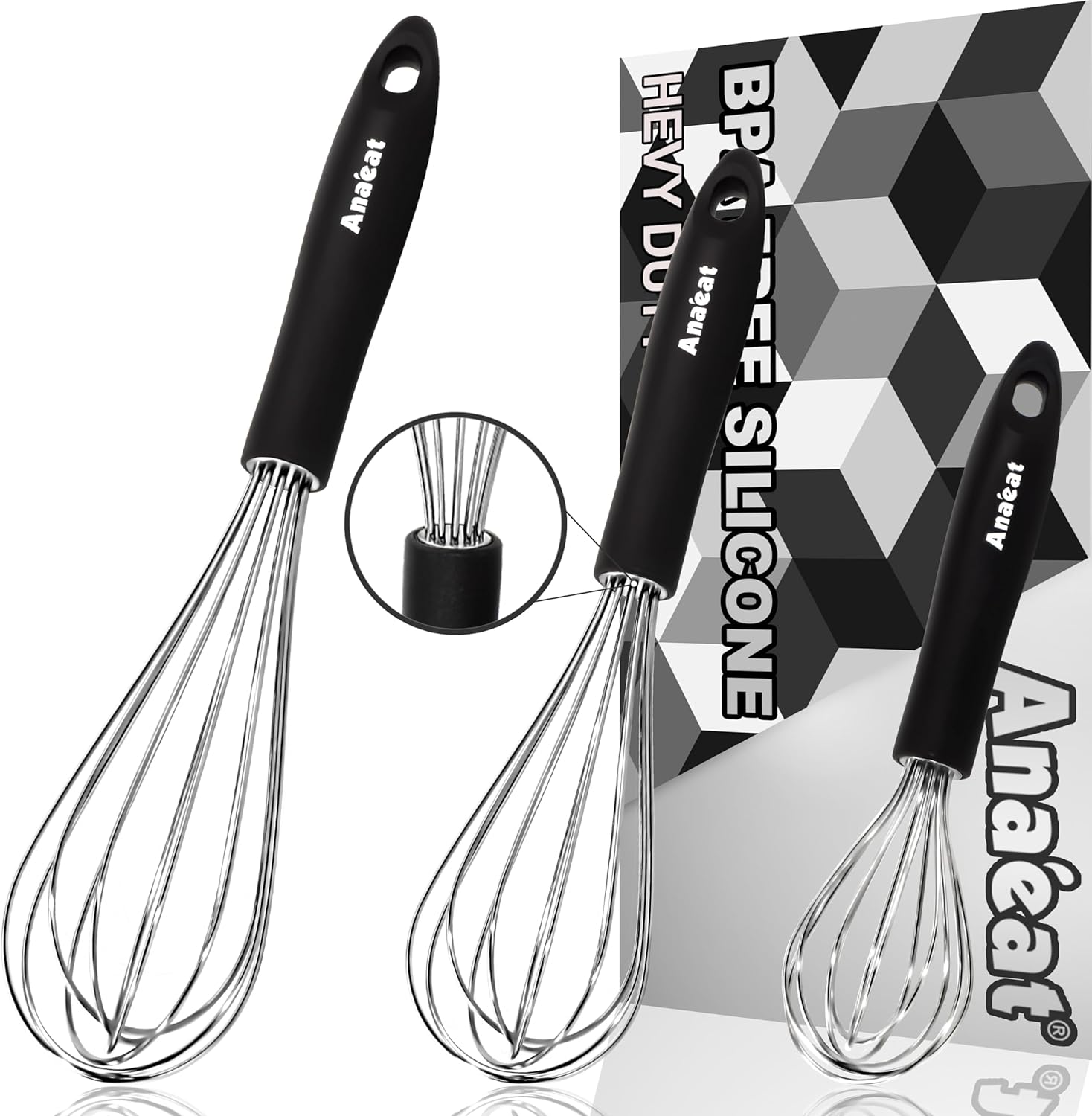 3 Packs Stainless Steel Whisk Set - Balloon Whisk, Anaeat Thick Stainless Steel Wire & Strong Handles, Egg Beater for Cooking, Blending, Whisking, Beating and Stirring (8.5"+10.5"+12")