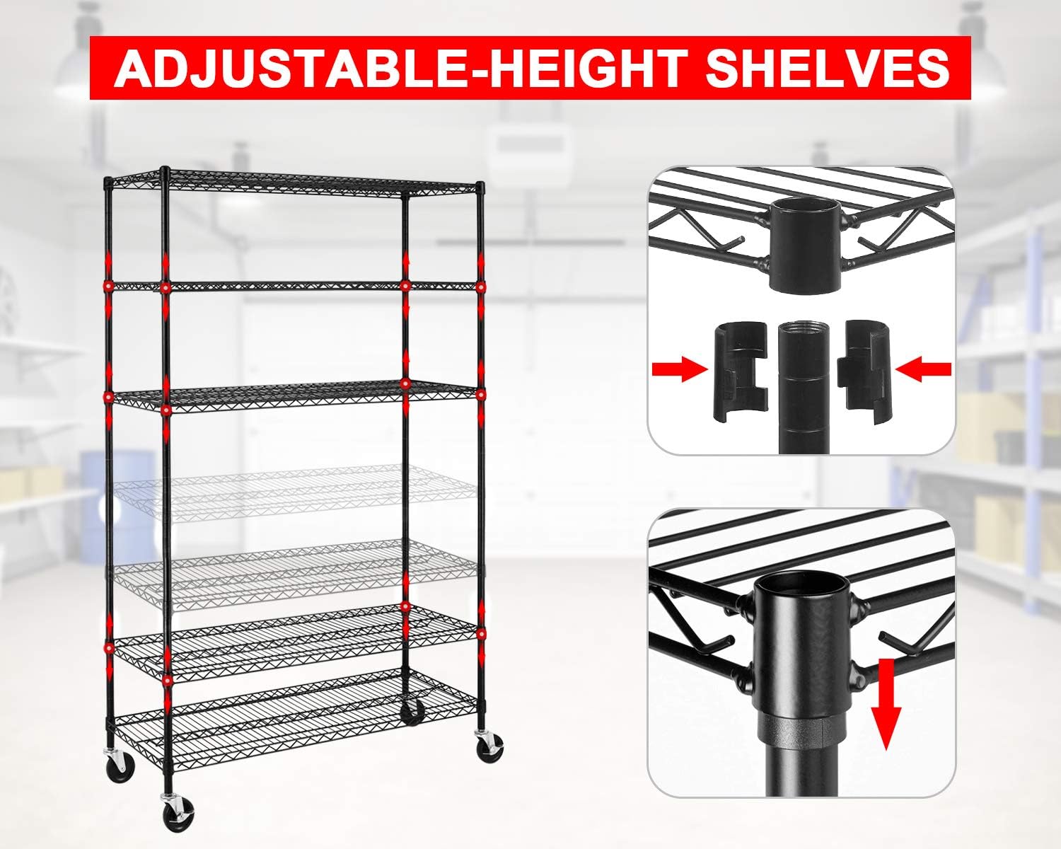 - ✔【Adjustable Height】 Enjoy a completely customizable metal shelving unit. The build allows for height adjustments - giving you the freedom to adjust accordingly to your needs. Comes with easy adjustable clips to secure and stabilize each shelf. The multi-purpose shelf rack is perfect for garage shelving, kitchen storage, pantry shelving, and more.