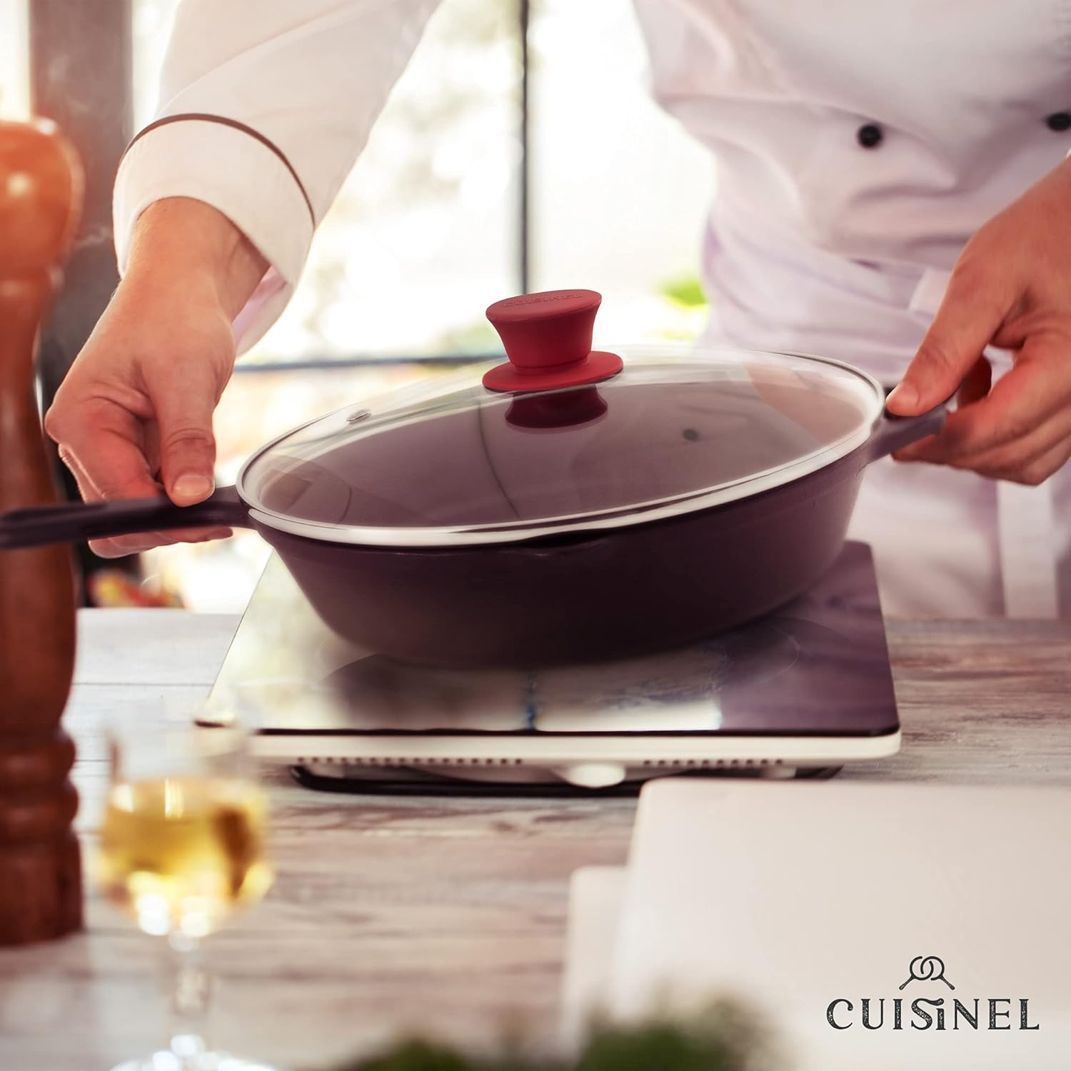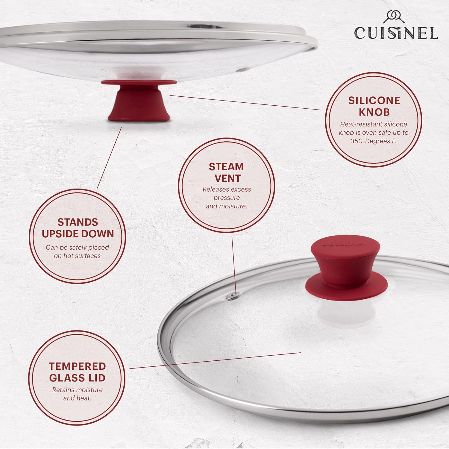 - STEAM VENT HOLE: Cuisinel's professional quality lids – now updated with steam vent holes to prevent liquid from boiling over. Vent holes allow just the right amount of moisture to evaporate easily so your food doesn't saturate in liquid. Vent holes make sure the glass lid doesn’t cloud up – allowing you to easily see cooking progress without removing lid.