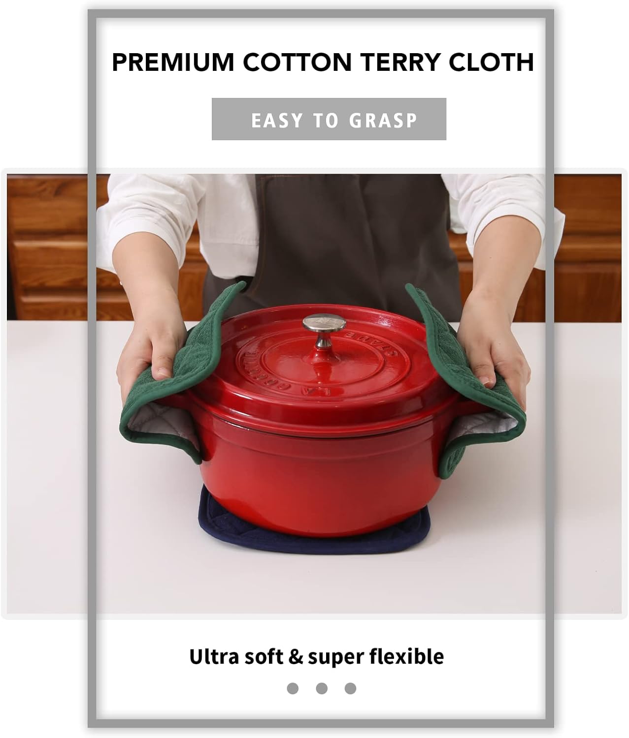 - QUILTED AND PADDED - Heat resistant up to 400 degrees allowing safe removal of baking dishes and cast iron from the oven and hot pots from the stove.