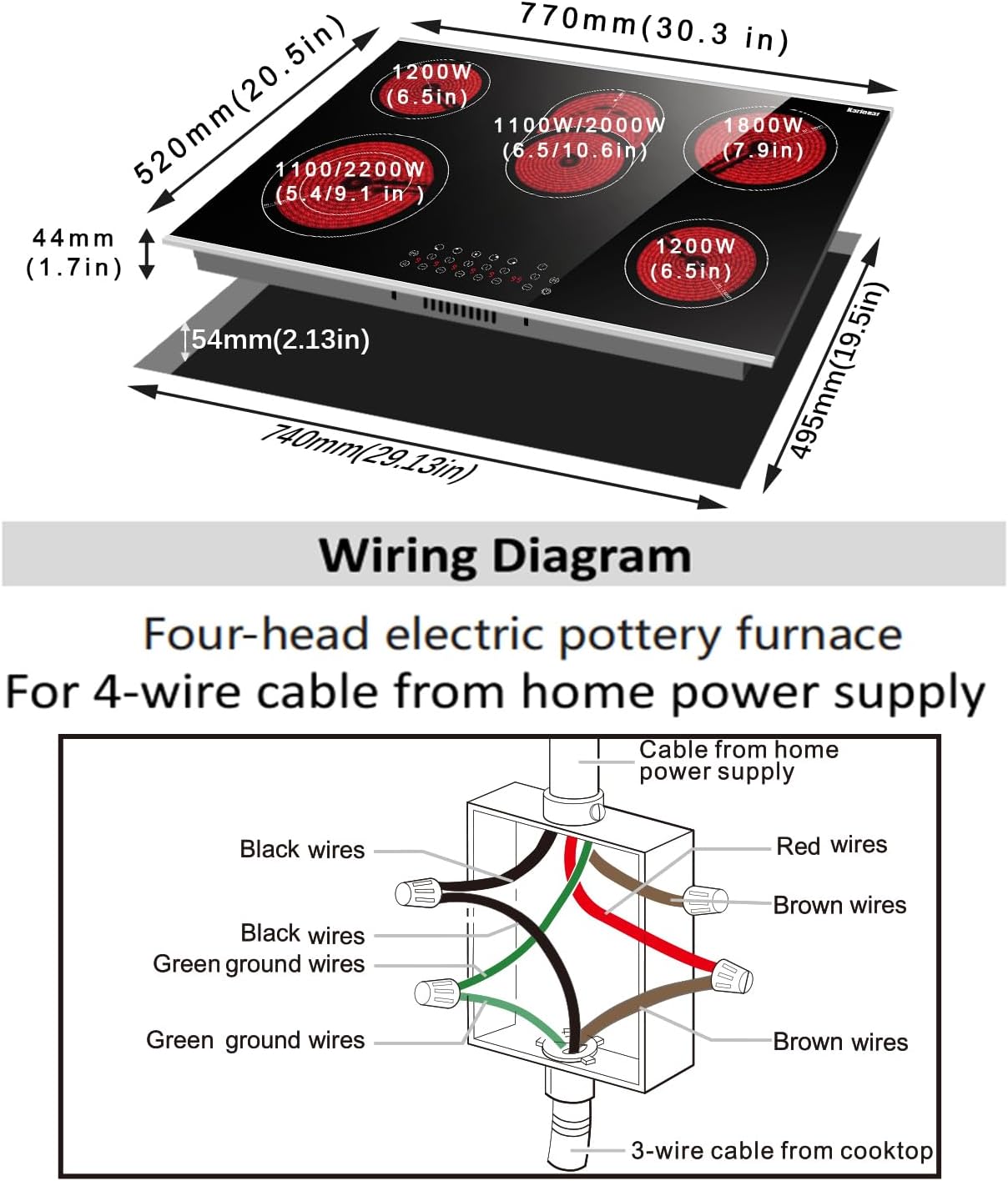 - 【8400W High Power Electric Cooktop】 Karinear 30 inch electric cooktop is equipped with 5 burners, 2 of which have expandable heating elements, convenient for larger cookware. The electric cooktop 5 burners reaches high power output of 8400W: 1200W+1200W +1800W+ 1100W/2000W(Dual) +1200W/2200W(Dual). 8400W High power cooktop heat up more quickly for you. Built-in Ceramic Hob 220-240v hard wired, NO Plug, need a professional electrician for wiring.