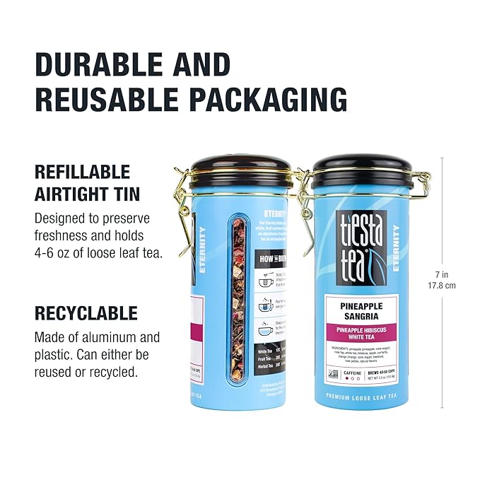 - FRESHNESS-LOCKING, REUSABLE TEA POUCH: Keep your tea fresh and flavorful with Tiesta Tea’s resealable, reusable stand-up pouch. Conveniently store your tea and enjoy a peek at the full-leaf goodness inside. Each tin brews 40-50 cups, making it perfect for gifting, sampling, or savoring every last scoop.