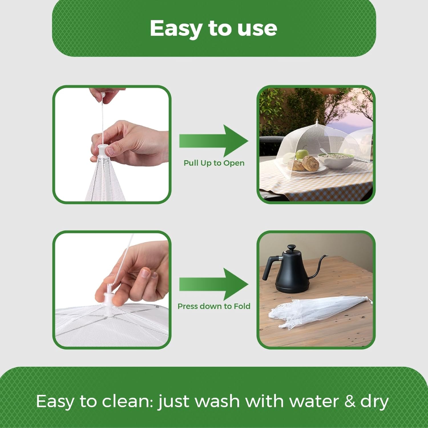 - Effortless Longevity: Crafted for repeated use, these food mesh covers for outdoors are easy to clean and maintain. A quick rinse with water and air drying preserve their durability, making them indispensable for all outdoor adventures