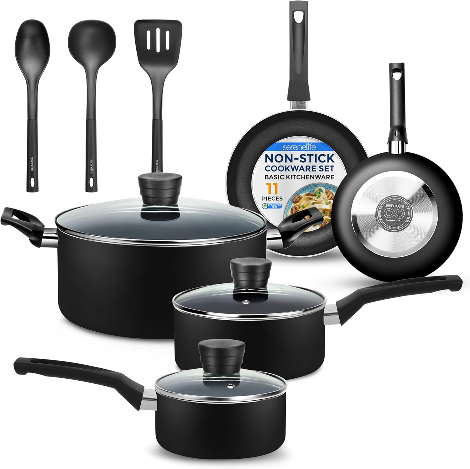 SereneLife Kitchenware Pots & Pans Basic Kitchen Cookware, Black Non-Stick Coating Inside, Heat Resistant Lacquer (11-Piece Set), One Size, Black