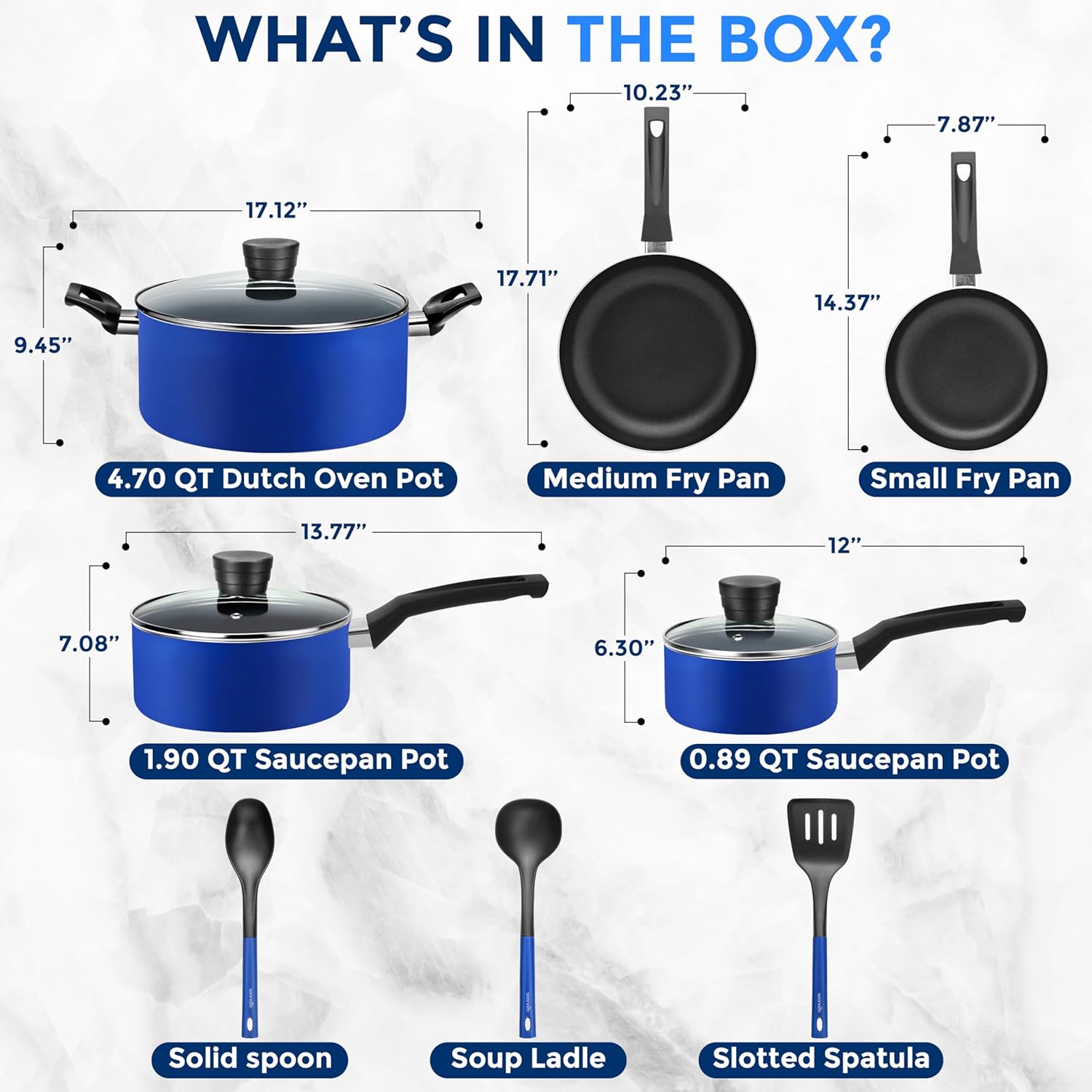SereneLife Kitchenware Pots & Pans Basic Kitchen Cookware, Black Non-Stick Coating Inside, Heat Resistang Lacquer (11 Piece set), One Size, Blue