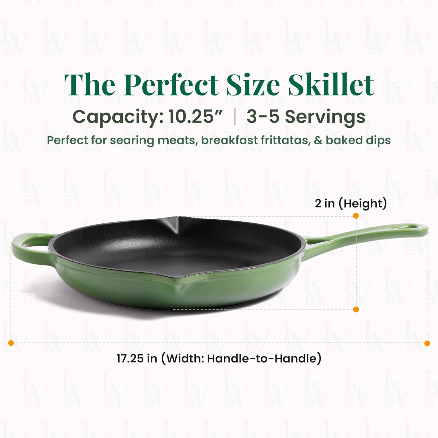 Larder & Vine Enameled Cast Iron Skillet | 10.25 inch Cast Iron Pan | Saute Pan with Pour Spouts | Enamel Coated Cast Iron Skillet | Compatible on All Cooktops & Oven Safe to 500° F | Okra