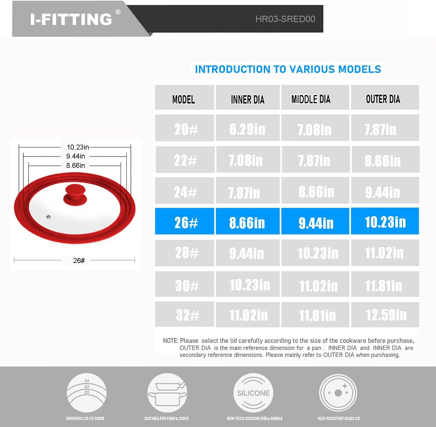 - 【UNIVERSAL LID WITH STEAM VENT】 Universal silicone glass cover lid suitable for pan/pot/skillet/saucepan/frying pan/soup pot , can fit 8.5", 9.5”, 10” (22, 24, 26CM ) cookware. Designed with stainless steel steam vent, effectively prevent overflow during cooking